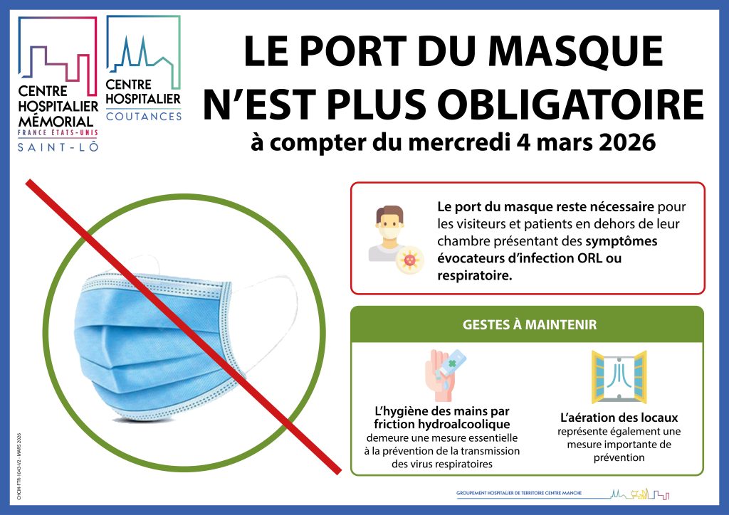 Compte tenu de la baisse de la majorité des indicateurs des virus (COVID-19, VRS et grippe) et bactéries responsables d’infections respiratoires aiguës, les Centres Hospitaliers de Saint-Lô et Coutances ajustent leurs recommandations sur le port du masque à compter de ce mercredi 4 mars 2026.